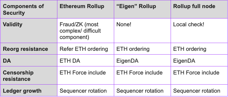 iii) Rollups built on EigenLayer have specific advantages. New virtual machines tailored to the roll up can be implemented whilst still using Ethereum trust guarantees. In addition, it inherits full safety and liveness attributes from Ethereum through Eigenlayer due to the full L1 state being locally available. The rollups facilitate easy building and deployment processes, streamlining the development and integration of applications. However, it's worth noting that there is no "default" safe bridge to Ethereum, which might pose a challenge.