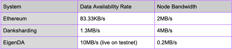 EigenDA is constructed upon the fundamental concepts of danksharding, which were originally developed by the Ethereum team, as the core technology. Because EigenDA is not burdened with the native constraints of Ethereum, it can process data at a multiple of 200x times that of mainnet. EigenDA is only able to do this because it doesn't have to host its own consensus and security.